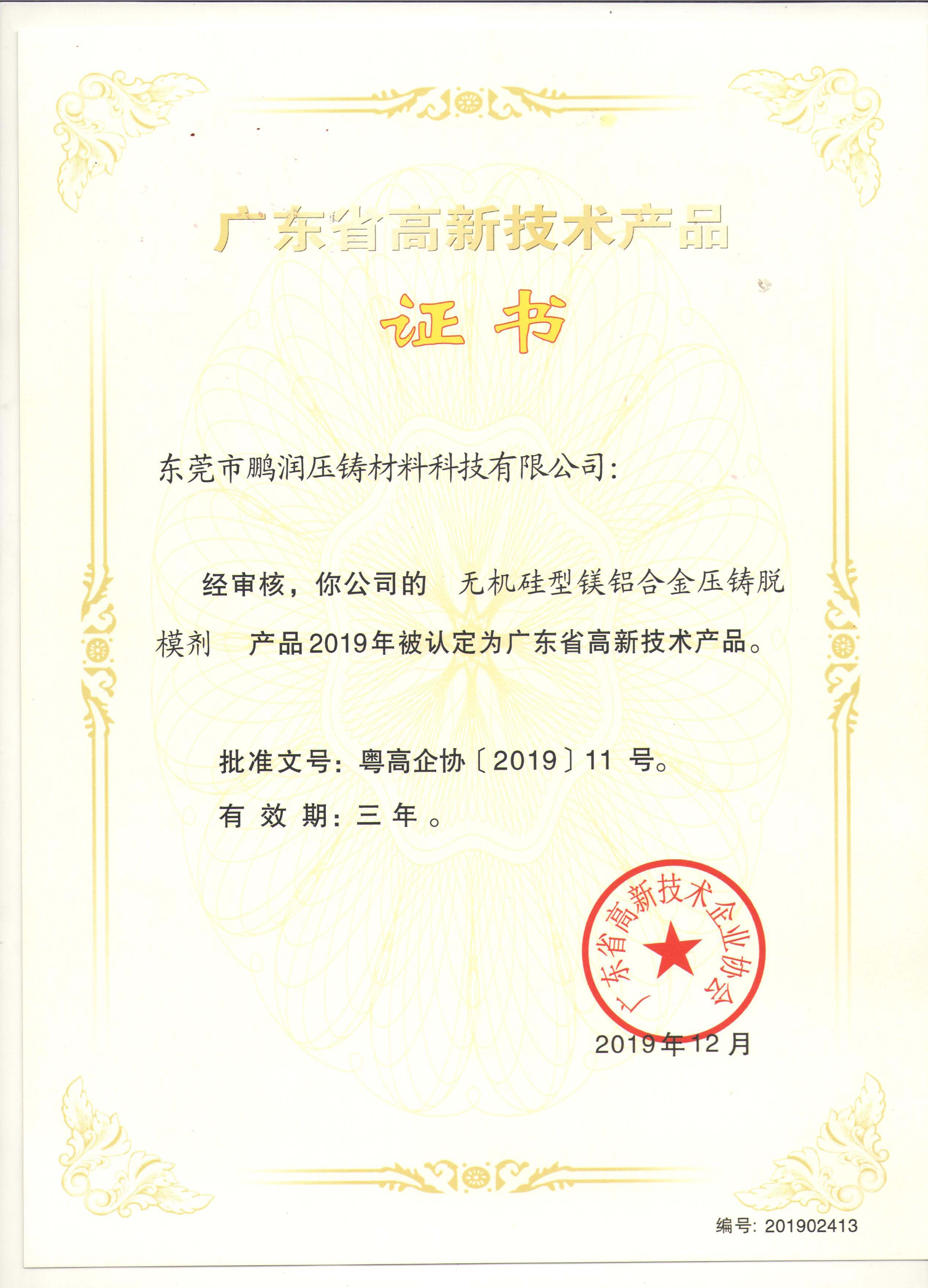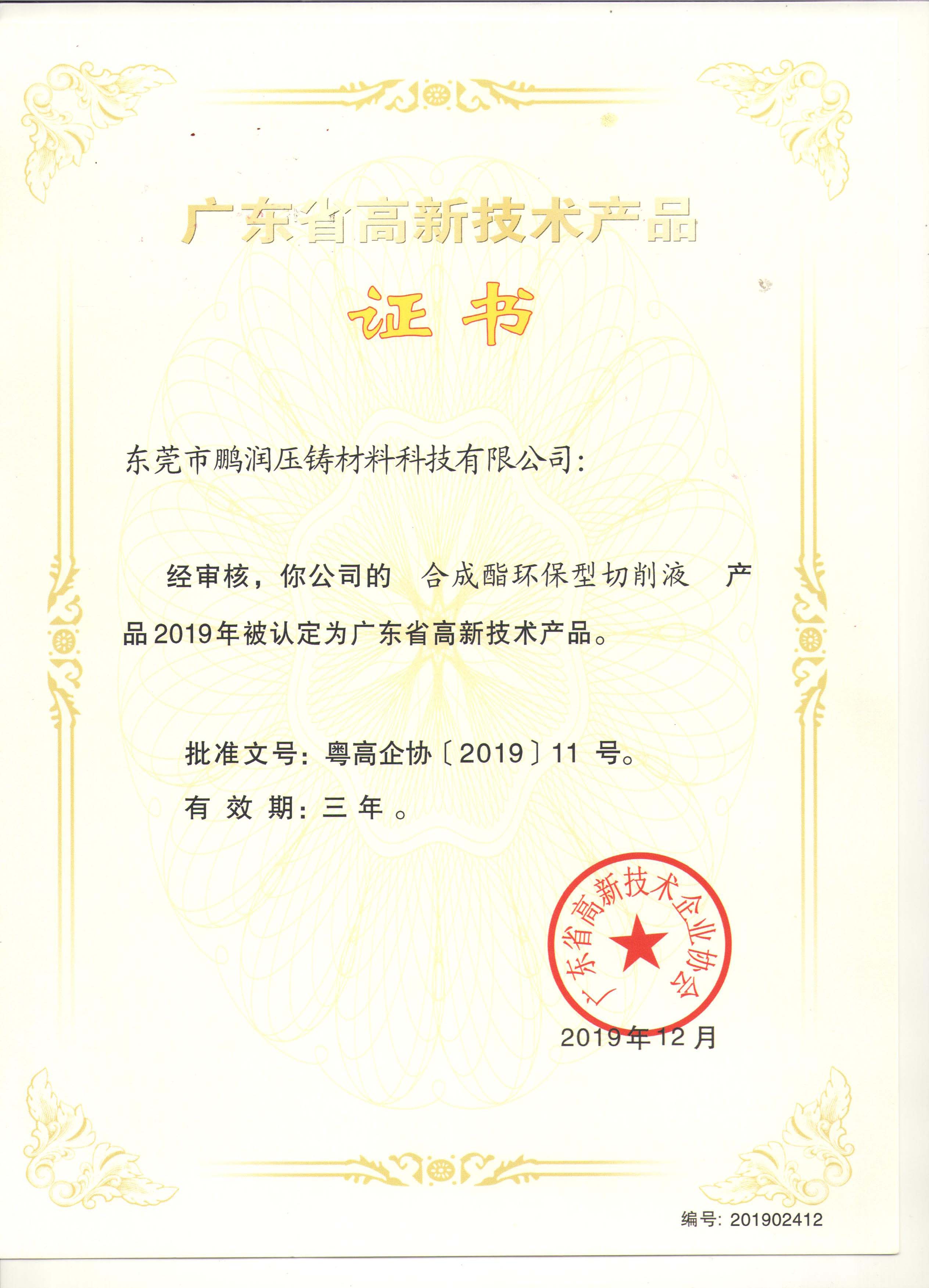 近日,我們?cè)俅潍@得由廣東省高新企業(yè)協(xié)會(huì)頒發(fā)的2項(xiàng)“廣東省高新技術(shù)產(chǎn)品證書(shū)”,證書(shū)有效期三年。獲得本次殊榮的是的產(chǎn)品是:“合成酯環(huán)保型切削液”和“無(wú)機(jī)硅鎂鋁合金壓鑄脫模劑”。